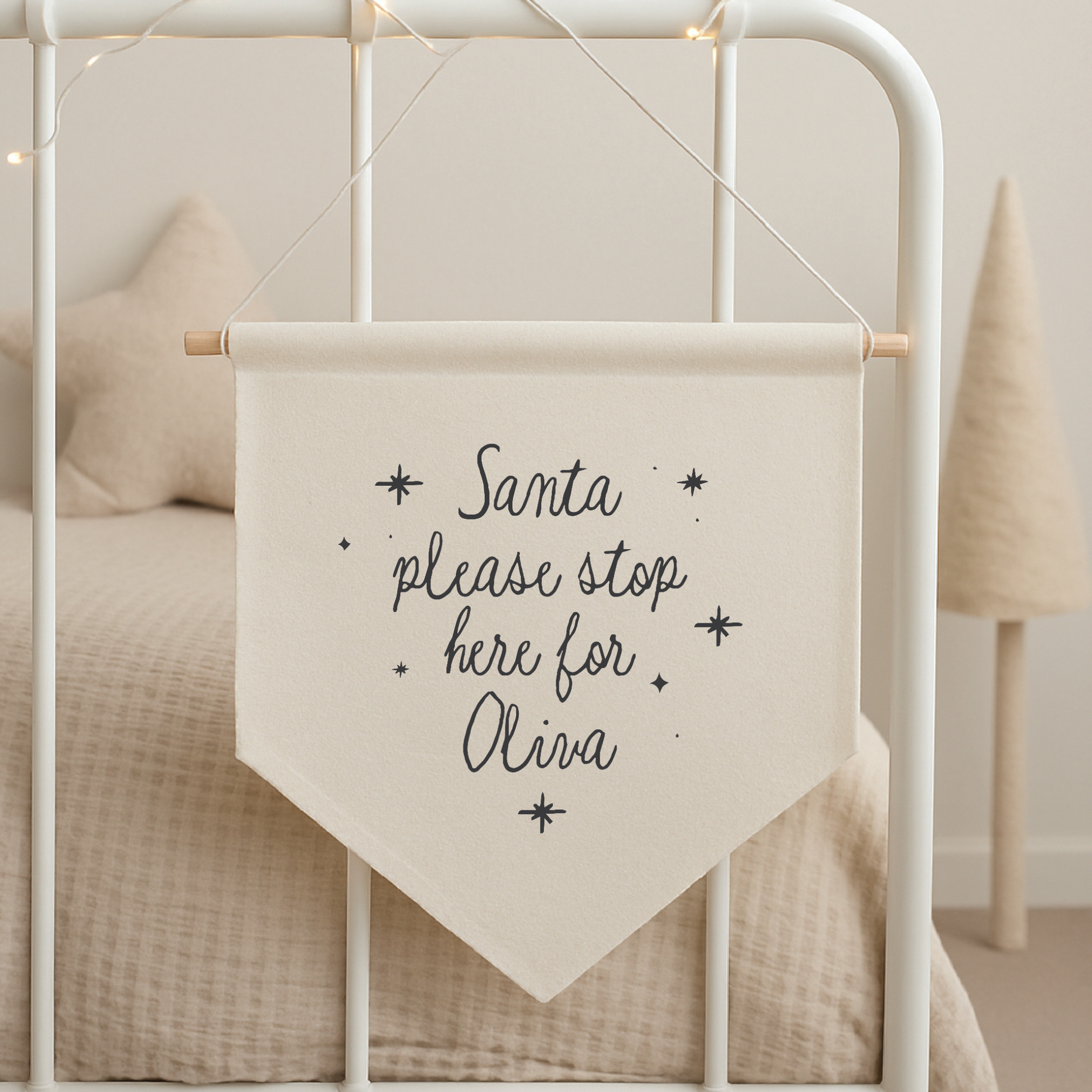 Make sure Santa knows exactly where to stop this Christmas! Our custom “Santa Please Stop Here” banner adds a magical, personal touch to your holiday décor — perfect for hanging by the fireplace, on a door, or in your child’s bedroom. ✨