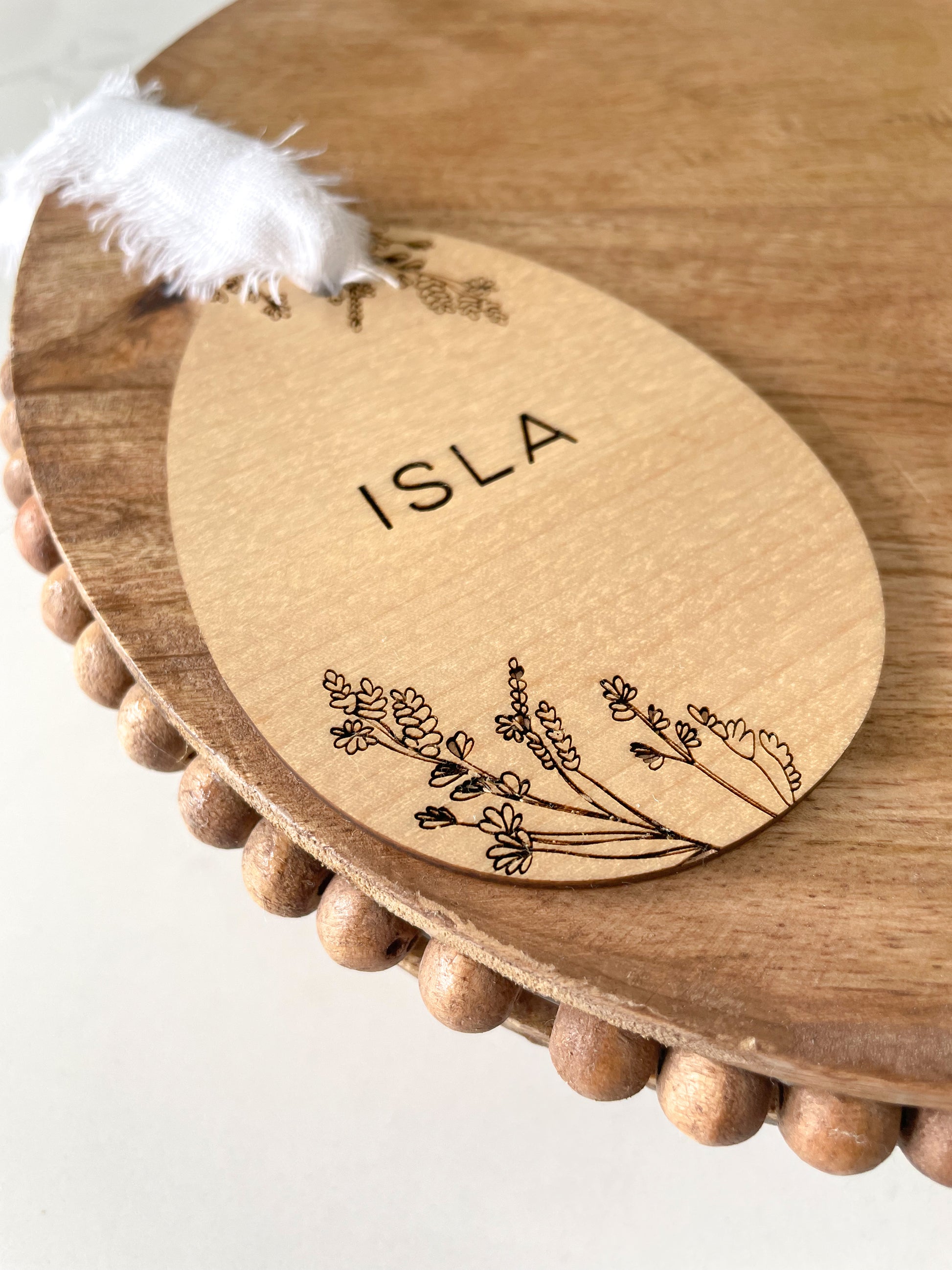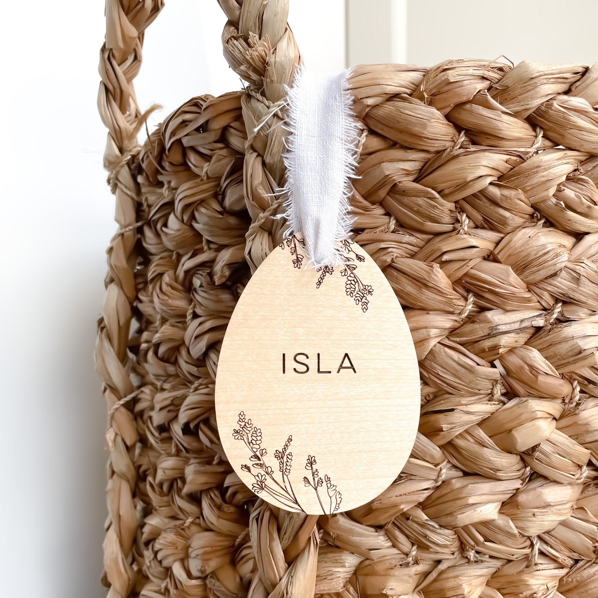 White UV printed easter tag with frayed linen ribbon